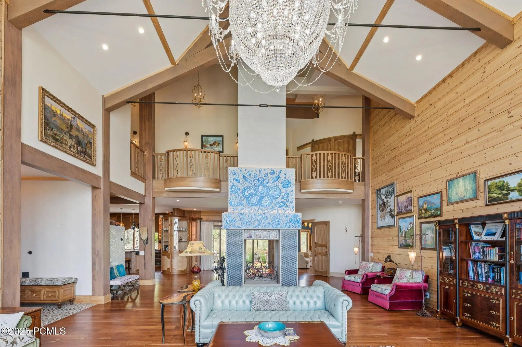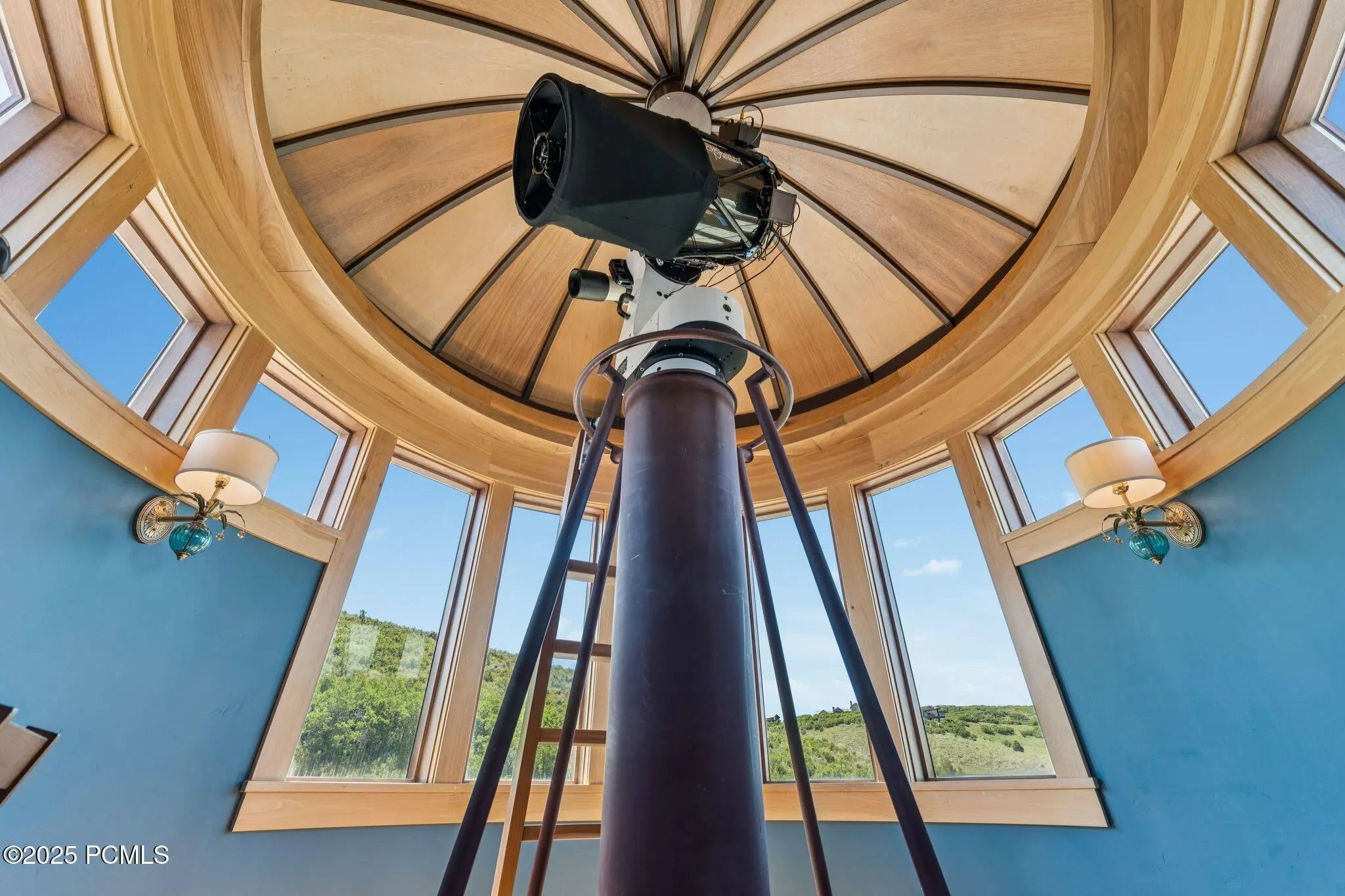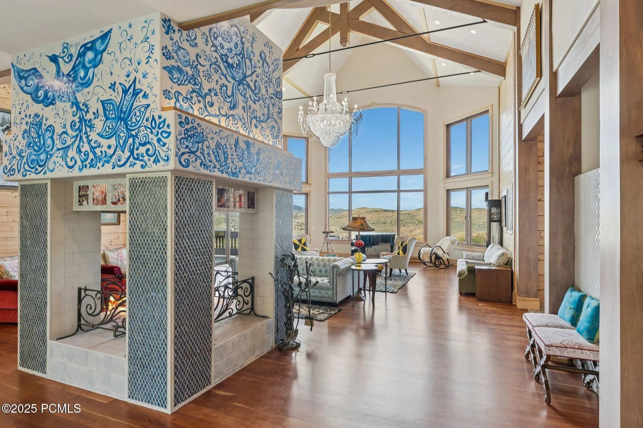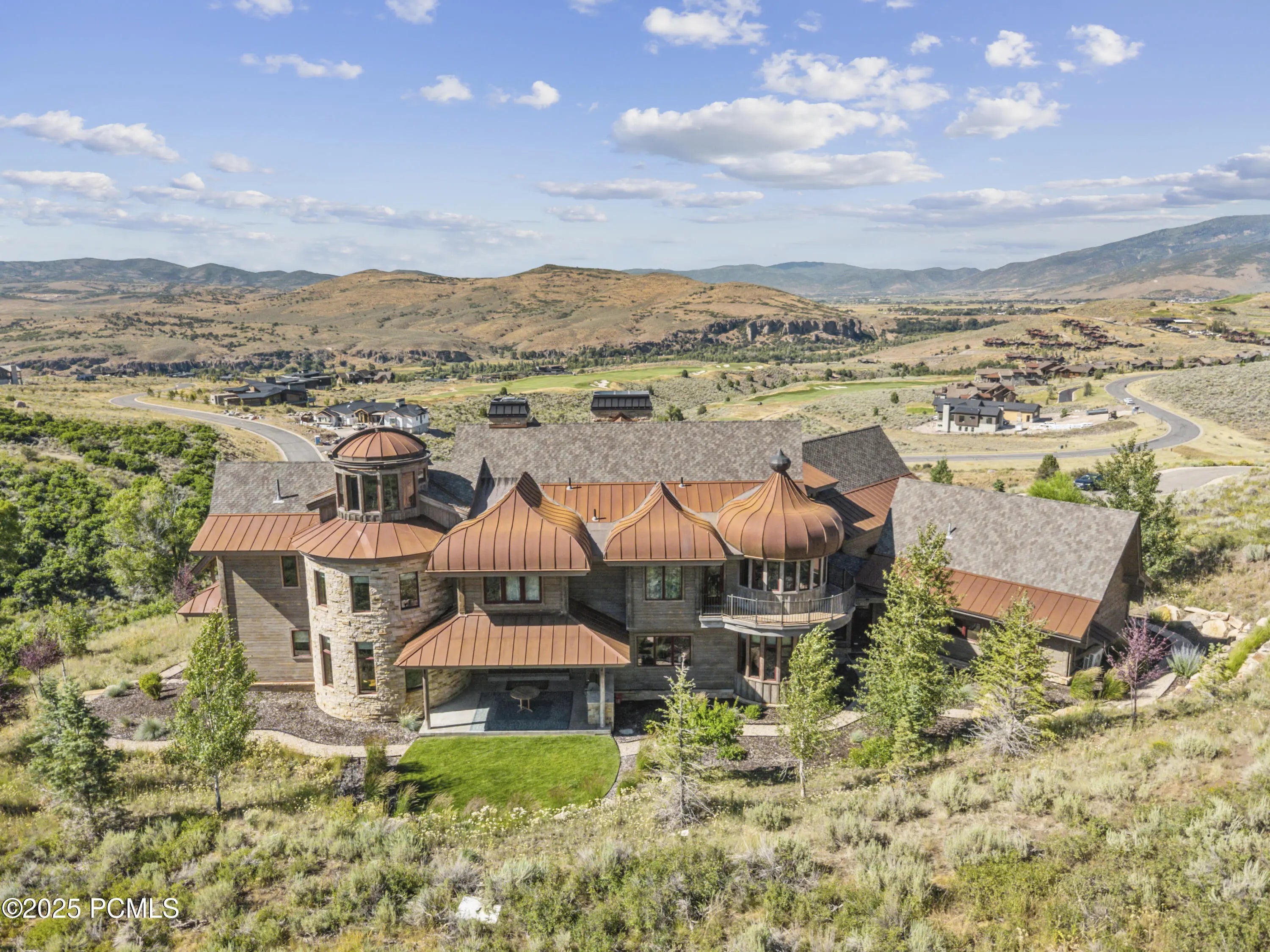 If you've ever dreamed of exploring the stars from your own home, this is the place. This extraordinary Victory Ranch residence blends old-world European artistry with the awe of a private observatory, complete with telescope and retractable dome roof. With handcrafted details including a1,000 sq ft spa, gourmet kitchen, turret library, and panoramic views, this home is both imaginative and masterfully executed. A true one-of-one. Perched on 4+ acres, this architectural masterpiece overlooks the renowned Rees Jones-designed golf course. Designed with intention, this Honka home features custom pine timber from Finland. The construction is natural, sustainable, and free from synthetic insulation. Throughout the home, custom Venetian lighting highlights the exquisite craftsmanship. The living room boasts soaring vaulted ceilings and expansive windows that frame breathtaking views. At its heart is a one-of-a-kind four-sided fireplace adorned with hand-painted designs. The elegant kitchen is a chef's dream, with custom walnut, maple, and glass cabinetry, a walnut countertop with iridescent blue inlay. Adding to its uniqueness is a custom Pechka and pizza oven, hand-built on-site. The extraordinary library is housed in a stone turret with curved walnut & maple doors and inlaid custom floors. Above it, a private observatory serves as the home's crown jewel, equipped with a telescope & a retractable dome roof. The home features 5 luxurious suites, each with unique scenic views. Outdoor living is just as impressive, with a covered patio featuring a built-in grill and multiple balconies. A two-car garage and custom dog wash station complete the home. Victory Ranch is a gated community on over 6,250 pristine acres with 4 miles of private Upper Provo River access, offering a lifestyle of unmatched adventure and serenity.